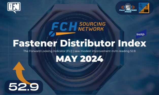 The seasonally adjusted Fastener Distributor Index (FDI) saw modest m/m improvement, reading 52.9 in May vs. 51.6 in April, and continued to expand (above neutral reading of 50), albeit driven by just one component, supplier deliveries. Commentary was again mixed, but our overall read was that demand conditions in May were generally seen as … Continue reading Fastener Distributor Index (FDI) | May 2024