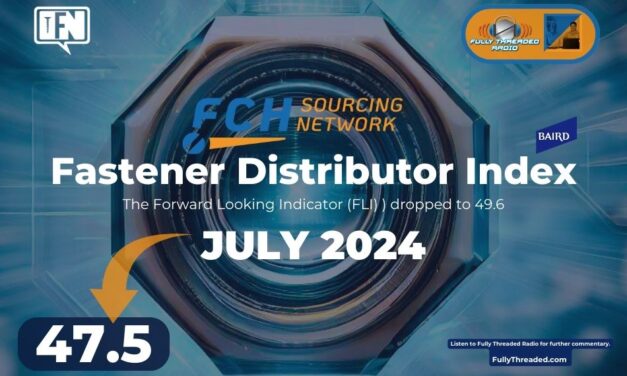 The Fastener Distributor Index (FDI) survey for July, 2024 dropped below 50, with a 47.5 reading versus 52.1 in June, seasonally adjusted. The Forward Looking Indicator (FLI) also dropped, sinking to 49.6. Key Points: FDI below 50 for first time since January. The July seasonally adjusted FDI declined to a reading of 47.5 compared to 52.1 in … Continue reading Fastener Distributor Index (FDI ) JULY 2024