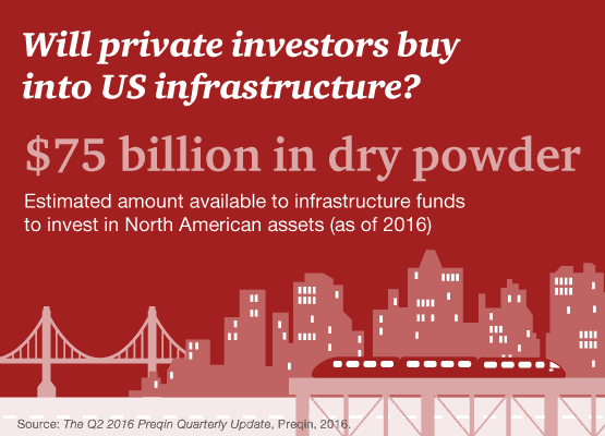 The time may be ripe for further public-private partnership (3P) growth in the US, as many municipalities and state budgets are stretched. With little shortage of eager capital on the sidelines, attracting private investors would likely mean placing emphasis on selecting those infrastructure projects that are high-quality and most bankable. By mid- 2016, infrastructure funds focusing on North American assets were sitting on $75 billion in dry powder. 3P activity in the US, for a number of reasons, have lagged relative to other countries, such as the UK.