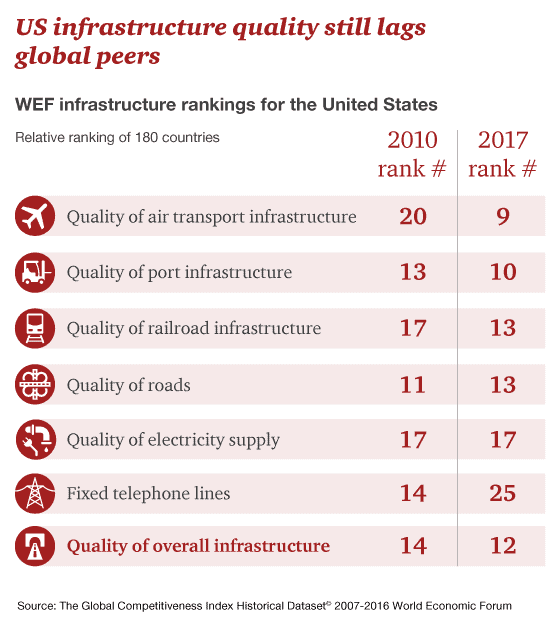 In the latest World Economic Forum’s annual Global Competitive Index, a global ranking of the quality of the business environment, US infrastructure lags other economies across several categories including quality of roads and ninth in air transport—areas the Trump administration has called out for more investment.