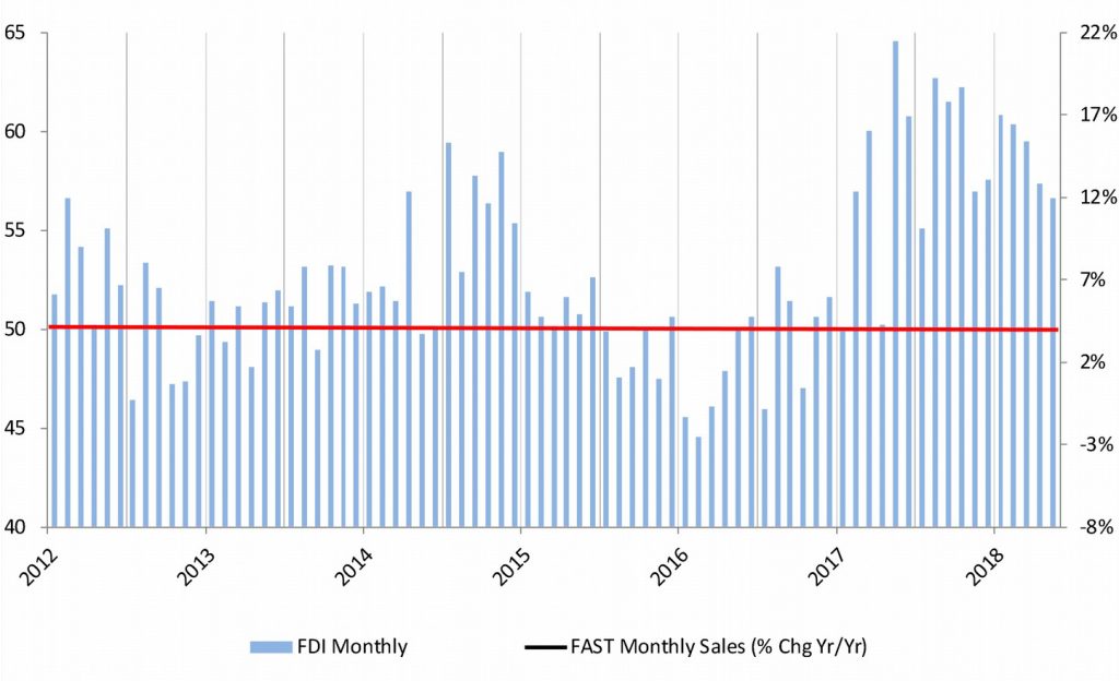 The seasonally-adjusted FDI for May 2018 was 56.6, continuing the YTD theme of a modest m/m deceleration, while still remaining well in expansionary territory. Selling conditions similarly moderated, with the seasonally-adjusted sales index coming in at 61.2 vs. 63.0 in April. Qualitative commentary on demand remains positive, and increasingly inflationary pressures from raw material increases/tariffs were again a common theme across respondent commentary. The six-month outlook remains strong overall, and the Forward-Looking Indicator was essentially unchanged m/m at 58.8 (April 58.9).Key Takeaway: