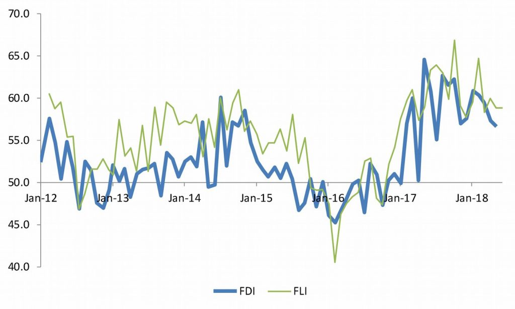 May FLI steady m/m. The seasonally-adjusted FLI was essentially unchanged m/m, registering 58.8 in May vs. 58.9 in April, as a slightly better employment index was offset by a modestly lower six month outlook. At 58.8, the FLI remains well into expansionary territory and is only slightly below averages seen across 2017 (60.9). Given solidly-expansionary FDI and FLI readings, we believe market conditions are likely to remain in growth mode (albeit potentially moderating growth) in the coming months.