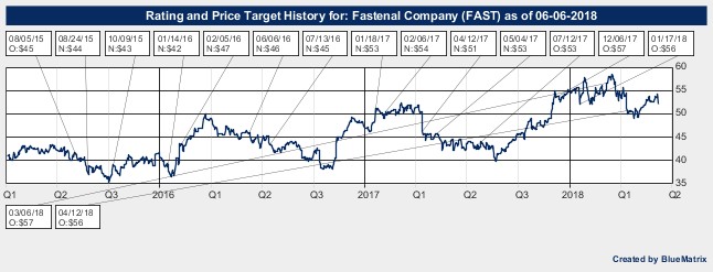 Fastenal reported May daily sales growth of 12.5% y/y, above our 11.5% estimate and again reflecting growth in all end markets/product lines. Underlying “core” growth (excluding foreign exchange) was 12.0%, the twelfth straight month of double-digit growth. Fasteners again saw strong growth at 9.1% y/y. Based on FDI data and other research inputs; we expect continued strength in public industrial distributor growth during 2018, with Fastenal y/y daily sales growth expected to remain in the double- digits through yearend.