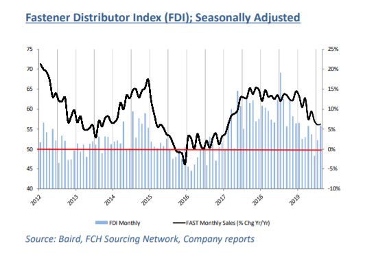 About the Fastener Distributor Index (FDI). The FDI is a monthly survey of North American fastener distributors, conducted with the FCH Sourcing Network and Baird with support from the National Fastener Distributors Association. It offers insights into current fastener industry trends/outlooks. Similarly, the Forward-Looking Indicator (FLI) is based on a weighted average of four forward-looking inputs from the FDI survey. This indicator is designed to provide directional perspective on future expectations for fastener market conditions. As diffusion indexes, values above 50.0 signal strength, while readings below 50.0 signal weakness. Over time, results should be directly relevant to Fastenal (FAST) and broadly relevant to other industrial distributors such as W.W. Grainger (GWW) and MSC Industrial (MSM).