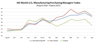 After expanding at a record pace in July, manufacturing activity slowed a bit in August but continued to grow robustly, with the IHS Markit Flash U.S. Manufacturing PMI declining from 63.4 in July to 61.2 in August.