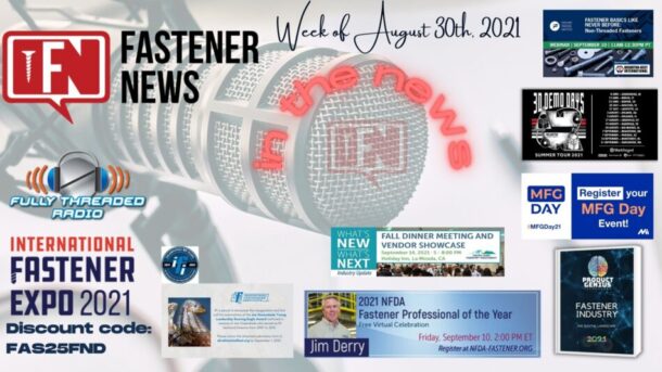 LIVE from the FASTENER TV STUDIO it’s IN THE NEWS with Fastener News Desk (6:48) It’s the week of August 30th, 2021. I’m Lisa Kleinhandler, editor in chief at FastenerNewsDesk.com Listen up ThreadHeads and FasteNerds Fully Threaded Radio is LIVE! Join hosts Eric Dudas and Brian Musker for a Special Report from the MWFA table … Continue reading IN THE NEWS with Fastener News Desk The Week of August 30, 2021