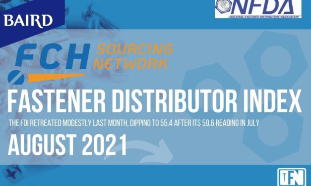 The Fastener Distributor Index (FDI) for August, 2021 The FDI retreated modestly last month, dipping to 55.4 after its 59.6 reading in July, seasonally adjusted. The Forward Looking Indicator (FLI) saw a dramatic rebound with a strong reading of 73.0, the 15th consecutive month of positive outlook. We encourage all North American fastener distributors to … Continue reading FASTENER DISTRIBUTOR INDEX (FDI) | AUGUST 2021
