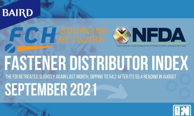 Fastener Distributor Index (FDI) for September, 2021 The FDI retreated slightly again last month, dipping to 54.2 after its 55.4 reading the previous month, seasonally adjusted. The Forward Looking Indicator (FLI) also slipped but remained strong at 69.5, the 16th consecutive month of positive outlook. Read the full report: We encourage all North American fastener distributors to … Continue reading FASTENER DISTRIBUTOR INDEX (FDI) | SEPTEMBER 2021