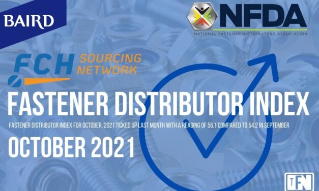 The Fastener Distributor Index (FDI) survey for October, 2021 ticked up last month with a reading of 56.1 compared to 54.2 the previous month, seasonally adjusted. The Forward Looking Indicator (FLI) contracted again slightly, but remained optimistic at 64.5, the 17th consecutive month of positive outlook. Read the full report: We encourage all North American fastener distributors to take part … Continue reading FASTENER DISTRIBUTOR INDEX (FDI) | OCTOBER, 2021