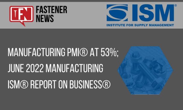 NEWS PROVIDED BY Institute for Supply Management Jul 01, 2022, 10:00 ET New Orders and Employment Contracting; Production and Backlogs Growing; Supplier Deliveries Slowing at a Slower Rate; Raw Materials Inventories Growing; Customers’ Inventories Too Low; Prices Increasing at a Slower Rate; Exports and Imports Growing; Record-Long Lead Times for Capital Expenditures and Production Materials TEMPE, Ariz., July 1, 2022 /PRNewswire/ — … Continue reading Manufacturing PMI® at 53%; June 2022 Manufacturing ISM® Report On Business®