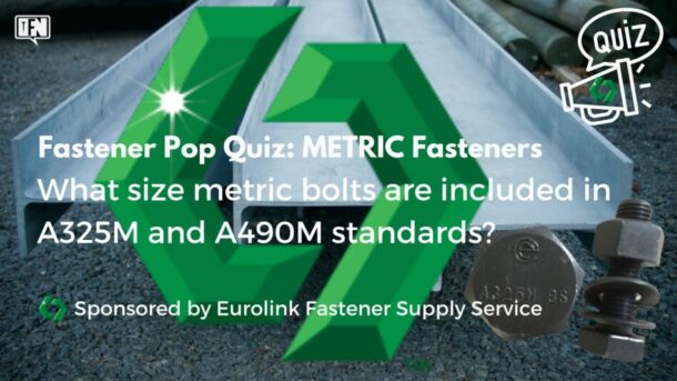 FASTENER POP QUIZ: METRIC FASTENERS [SPONSOR] EUROLINK FASTENER SUPPLY & SERVICE “Hard-to-Find Metric Fasteners Delivered” Q: What size metric bolts are included in A325M and A490M standards? WATCH VIDEO NOW TO FIND OUT THE CORRECT ANSWER Eurolink is the premier US distributor of metric fasteners and fastener lines with hard-to-find metric fasteners manufactured to … Continue reading Fastener Pop Quiz: Metric Fasteners
