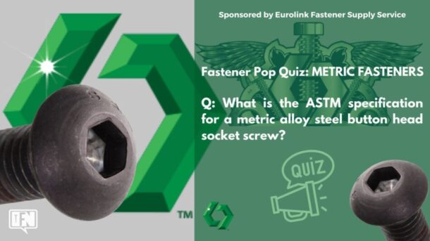 FASTENER POP QUIZ FEATURING METRIC FASTENERS [Sponsor] EUROLINK FASTENER SUPPLY SERVICE “HARD-TO-FIND METRIC FASTENERS DELIVERED” Q: What is the ASTM specification for a metric alloy steel button head socket screw? A: WATCH VIDEO NOW TO GET THE CORRECT ANSWER Eurolink is the premier US distributor of metric fasteners and fastener lines with hard-to-find metric fasteners manufactured … Continue reading Fastener Pop Quiz: METRIC FASTENERS