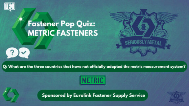 ARE YOU READY TO TEST YOUR KNOWLEDGE OF FASTENERS? [SPONSOR] EUROLINK FASTENER SUPPLY SERVICE “HARD-TO-FIND METRIC FASTENERS…DELIVERED” QUESTION: What are the three countries that have not officially adopted the metric measurement system? A: WATCH VIDEO NOW FOR THE CORRECT ANSWER Eurolink is the premier US distributor of metric fasteners and fastener lines with hard-to-find … Continue reading Fastener Pop Quiz: METRIC FASTENERS